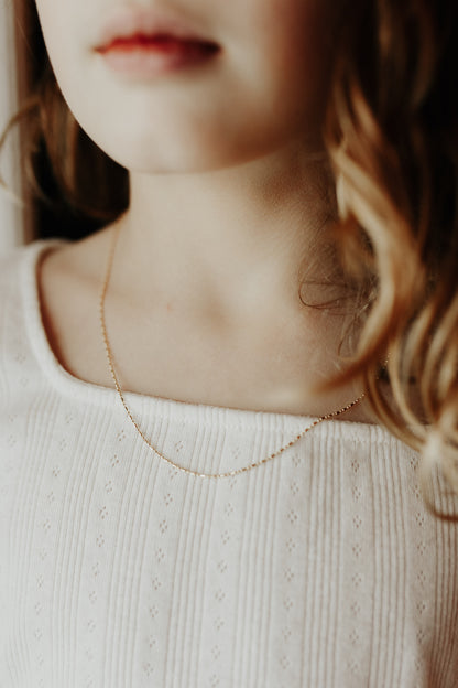 Featuring a delicate 1mm diameter bead bar, this necklace is a timeless design. The dainty, thin chain drapes gracefully around your neckline. Whether worn alone for a minimalist look or layered with other pieces, this versatile necklace is ideal for both casual and formal occasions.